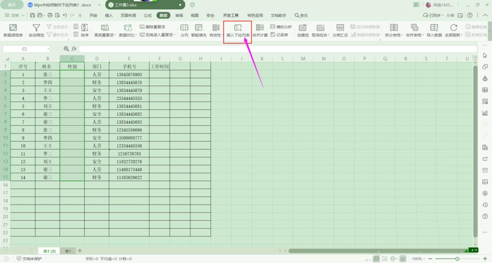 3、数据工具栏,选择“插入下拉列表”命令,如下图所示: