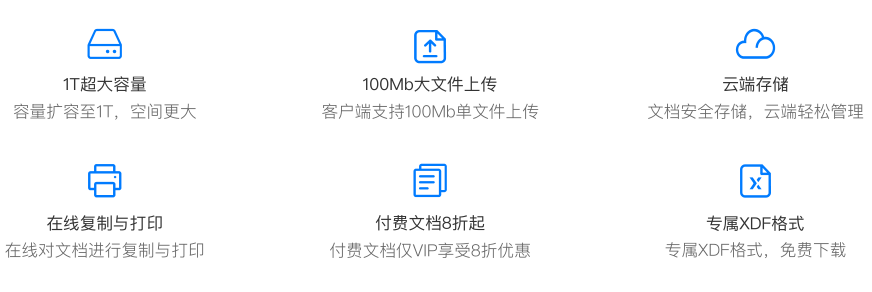 ① 1T超大容量 ②100Mb大文件上传 ③云端存储 ④付费文档8折起 ⑤复制与打印 ⑥XDF专属格式