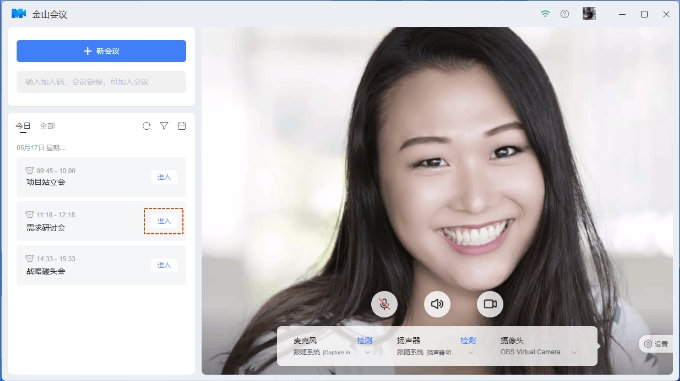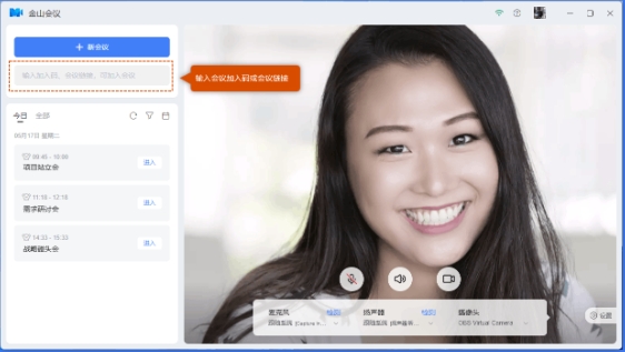 我最喜欢它的地方是入会前就能检查设备状态,这样参会时就不会因为摄像头或者麦克风的问题尴尬了。另外,它还有预约会议的功能,日程会直接显示在金山日历上,系统还会自动提醒,非常贴心。