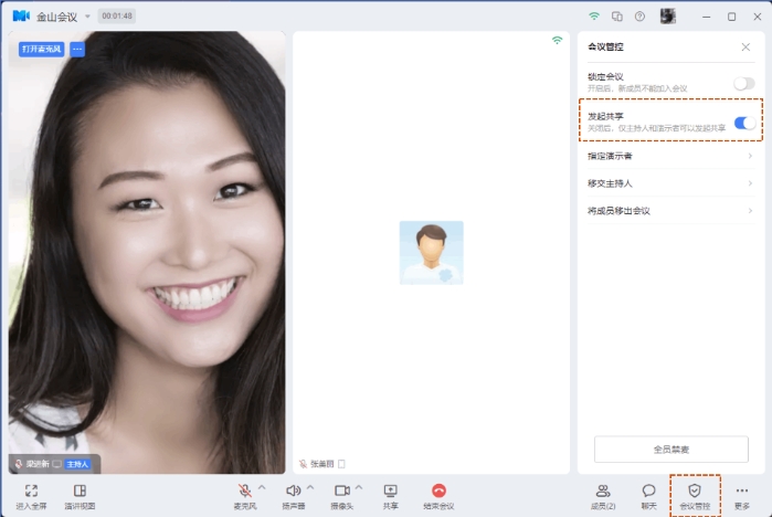 关闭“发起共享”权限后,仅允许主持人和演示者发起共享。主持人点击页面底部“会议管控”,关闭“发起共享”选项即可。