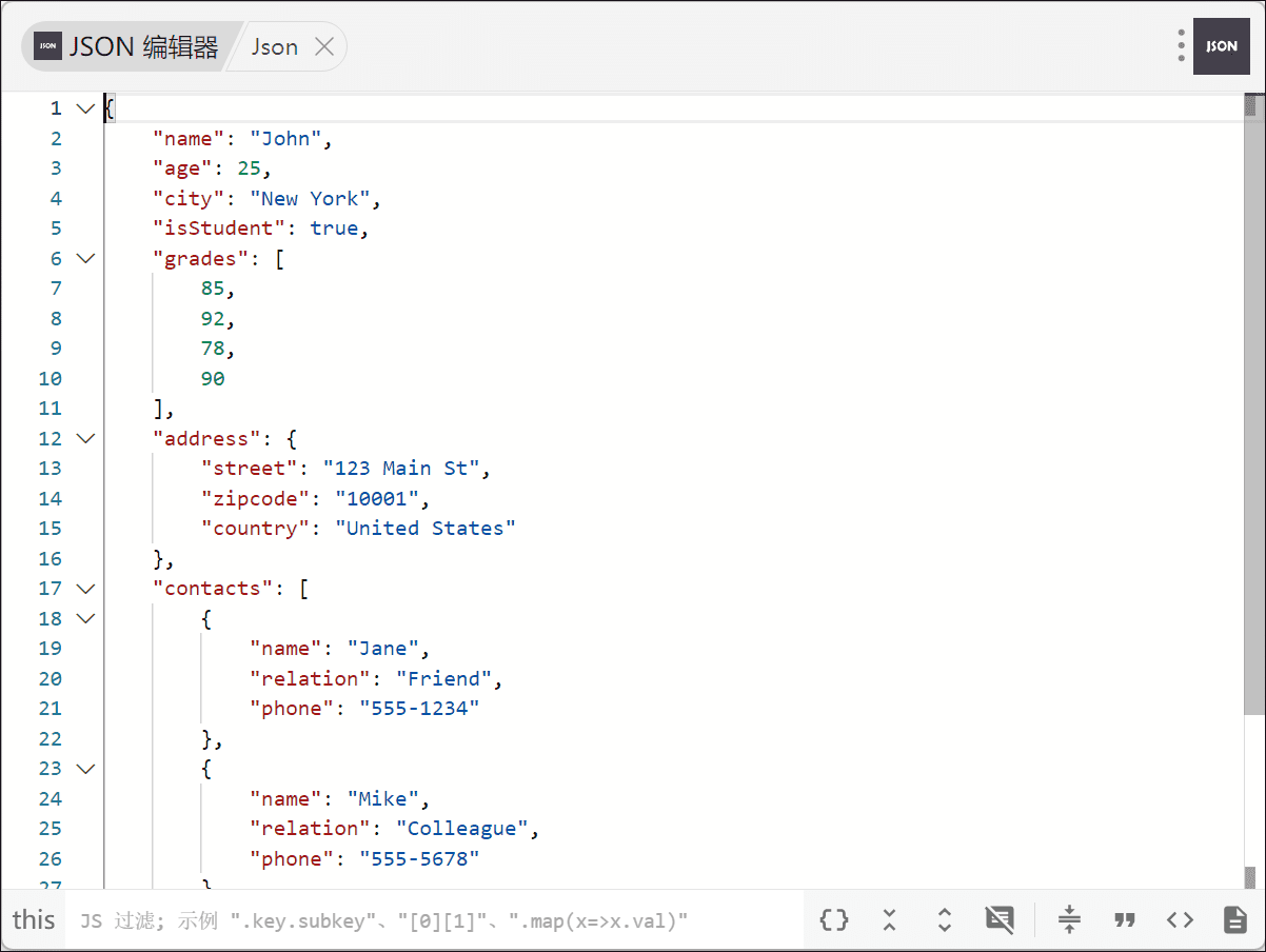 (3)然后 json 编辑器插件就会帮你格式化、着色高亮、并转换中文编码,让你直观地查看 JSON 数据。它还提供一个小输入框,可以用 js 语法进一步过滤或提取 json 片段。