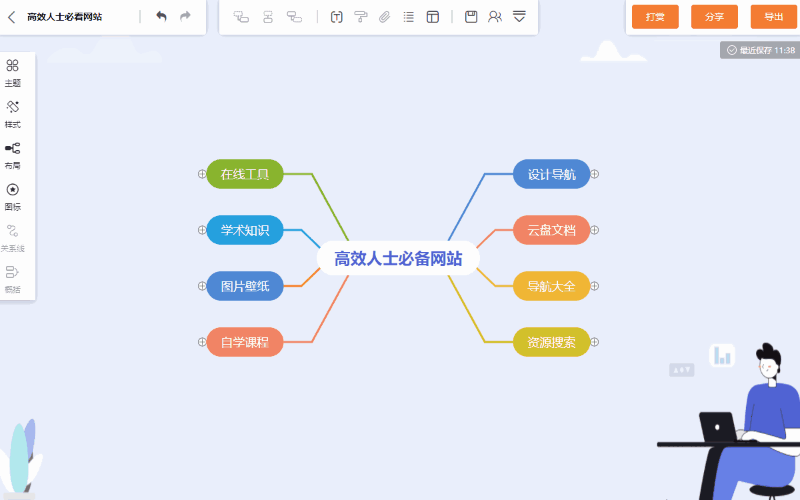 GitMind提供了7种常见的思维导图布局,包括放射图、结构图、目录组织图、组织结构图和鱼骨图等,做完了思维导图内容后发现一开始选的布局不合心水,这时轻轻一点就能一键切换,搭配顶部的“整理布局”功能,干净又整洁!