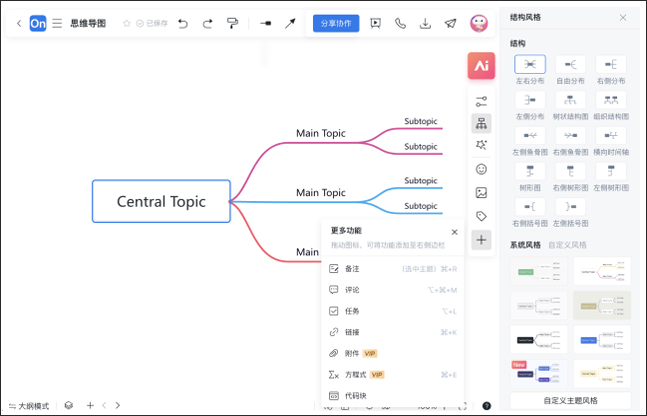 ProcessOn的组件插入功能非常丰富,包括图标、图片、LaTeX公式、代码块等,满足各种场景需求。海量模板库更是让创作变得更加高效,用户可以直接克隆模板并进行个性化修改。除此之外,软件还支持一键切换思维导图和思维笔记模式,灵活应对不同工作方式。