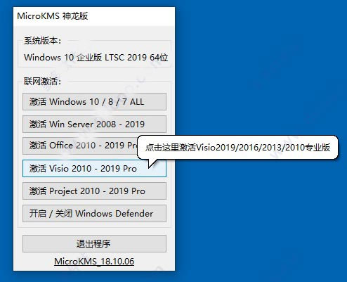7、这里打开软件包的visio2019激活工具“microKMS_v18.10.06 去广告版”直接点击激活注册;