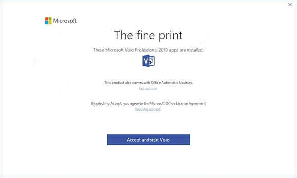8、再次打开visio2019,可以看到软件成功激活,点击accept and start visio按纽继续;
