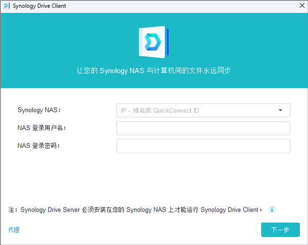 2、Synology Drive Server安装配置好后用户即可启动synology drive client,然后在登录界面中输入配置好的ip域名进行登录使用