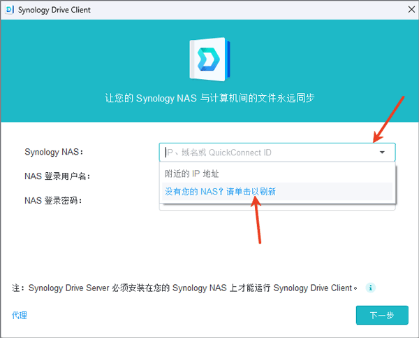 3、如果登录失败可能是没有检测到,用户可以在登录界面中先点击下拉按钮,然后点击刷新选项刷新下nas服务器