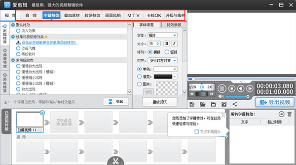 爱剪辑提供众多文字特效:风沙特效、火焰特效、水墨特效。各种琳琅满目的超炫特技效果。