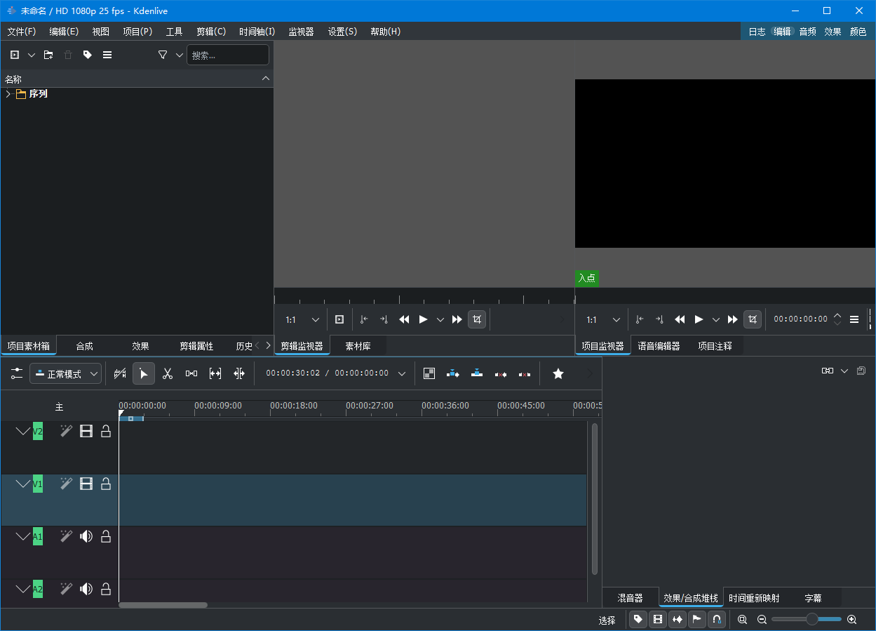注意时间轴中,在上的视频轨道的内容会遮挡在下的视频轨道;而各音频轨的素材会同时播放。