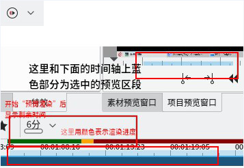 被框出的两个按钮用于设置预览窗口时间轴上预览区段的起点和终点,“播放”按钮右部的小箭头下拉框中可以选择“播放区段”。