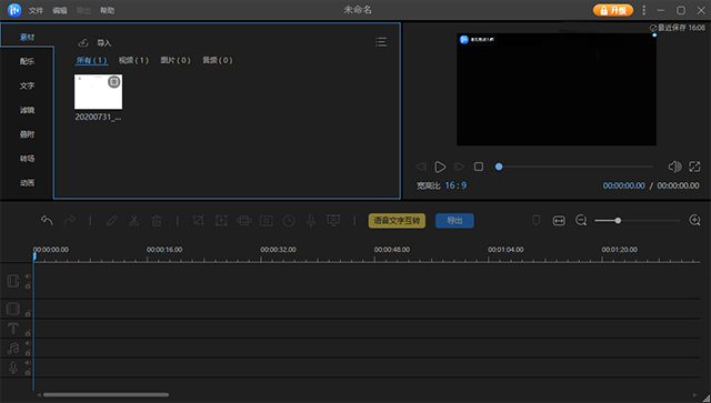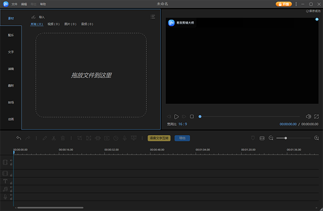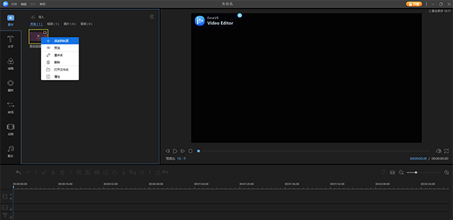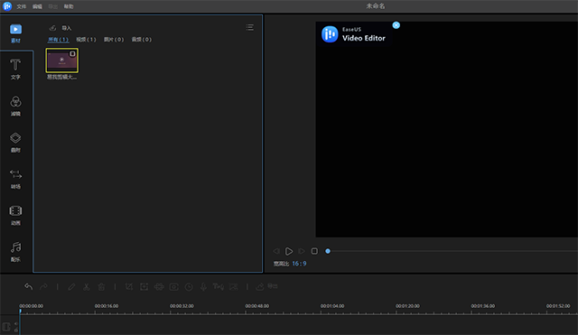 启动易我剪辑大师(EaseUS Video Editor)后,选择影片比例,有9:16、16:9和4:3共三种,以下皆以16:9示范。选择左侧第一个功能「素材」按下「导入」,或是直接将素材从计算机的资料夹拖移至素材区。