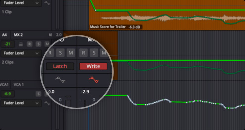 Fairlight如今搭载每个通道自动化模式选择,可为项目混音实现更灵活和更具创意的控制。如今,您只需单遍处理就可以对多个单独轨道进行动态调整,并在吸附、锁存以及修整中设定各个通道的自动化设置。