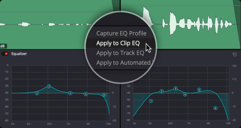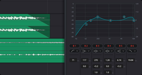 如今,快编、剪辑和Fairlight页面均搭载6频段片段均衡器。从而可以在片段层面实现更多的音调控制,以匹配调音台的轨道均衡器。因此,如今您可以在片段、轨道以及EQ插件间轻松复制和粘贴设置,实现更一致、灵活和精确的控制。