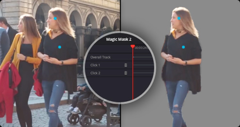 神奇遮罩经改进可在单个模式中实现更为精准的跟踪。使用点来选择人物、物体和区域,使用画笔工具更快速地对选择范围进行微调。神奇遮罩可直观地跟踪所选区域的动作,甚至周围有障碍物或低品质片段亦能工作。