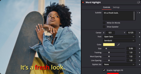 让观众的注意力集中在视频上,字幕会随着说话而动画处理。使用转录工具可以在时间线上生成字幕轨道,然后将动画Fusion字幕模板拖到轨道头上来更改外观和文字动画风格。