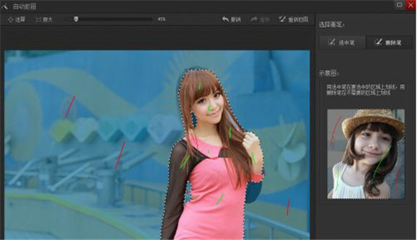 2、点选中笔或删除笔,选中笔点中为需要留的部分,比如下图要留这个人物,就在这个人物的头发皮肤衣服等上面用选中笔划线。把背景用删除笔划线。