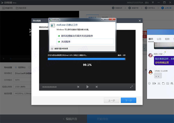 六、如图,遇到导出视频时跳出弹框显示“melt.exe”已停止工作,怎么办?