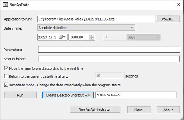 8、并且以管理员身份运行,首先选择安装目录文件EDIUS.exe,可随意设置到期时间,勾选”immediate mode -change”,最后点击Create Desktop Shortcut;