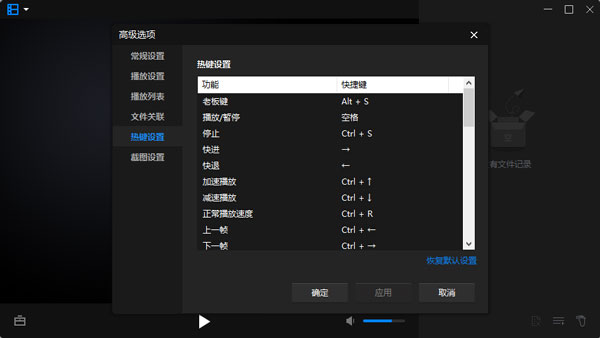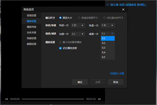 4、如果想要调整点击箭头时的倍速,也可以进入到高级选项中的播放设置列表下,修改加速一次和减速一次的速度,可以从0.1到0.5之间进行选择,最后选择应用即可;