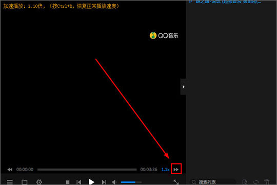 2、如果用户想要将视频的播放速度调节成加速播放,则需要直接点击红框标注内的“→”箭头选项,可看到视频播放窗口的左上角出现了加速播放1.10倍的提示,也就代表加速播放成功了,当你觉得当前的速度不符合你的预期时,可以重复点击箭头选项进行加速;