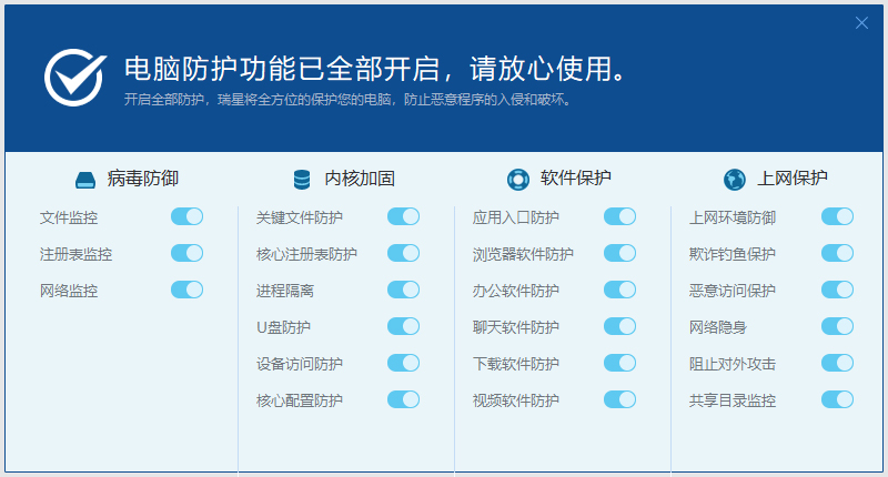 瑞星电脑防护由【病毒防御】、【内核加固】、【软件保护】和【上网保护】四大功能组成。