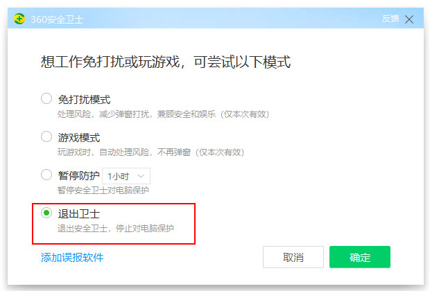 2、点击退出后,弹出选择框,如下图所示,如果你想玩游戏或免打扰,可以选择游戏模式、免打扰模式、暂停防护等选项,如果这些选项都不合适,可以在继续退出选项,这样用户就可以退出360安全卫士了。