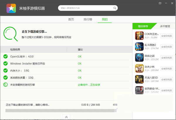 1、成功安装后,打开软件,米柚手游模拟器将自动下载游戏引擎并安装;