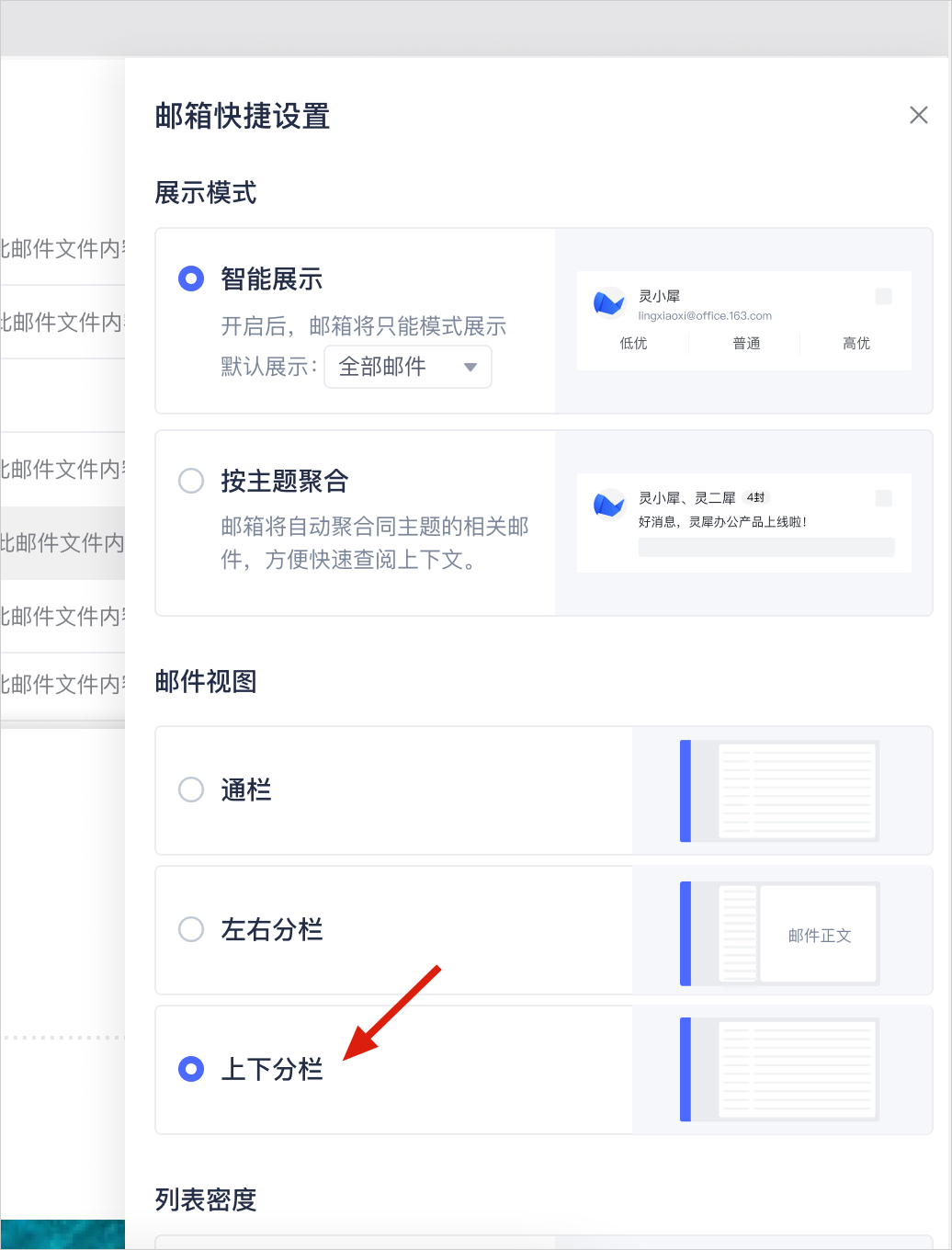 在邮箱快捷设置面板中选择【上下分栏】