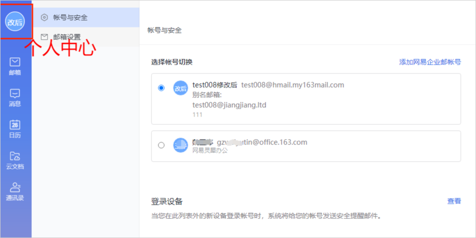 【个人中心-账号与安全-登录设备】显示当前账号登录过网易灵犀办公灵犀办公的所有设备,当账号在新设备登录网易灵犀办公时,系统会给账号发送新设备登录提醒邮件和短信。