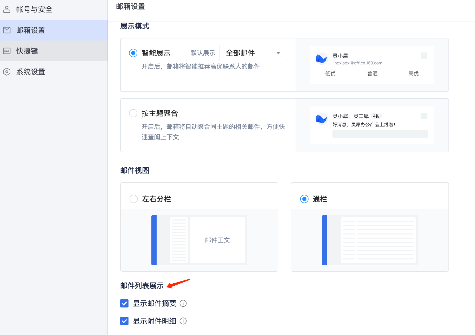 -用户可以根据自己的使用习惯,设置邮件列表是否展示邮件摘要、是否显示附件明细;