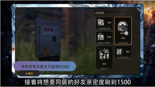 1、把自己的庄园升级到三级,将想要同居的好友亲密度刷到1500。