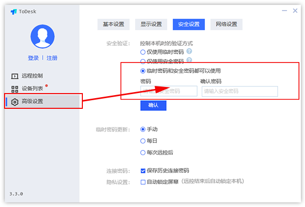 一直卡在密码输入确定界面:尝试在任务栏中,右键,退出软件,过几分钟,再打开,重新连接。另外,在todesk界面看看高级设置旁边是否有一个红箭头,如果有,被控和主控电脑都升级一下为最新版本。