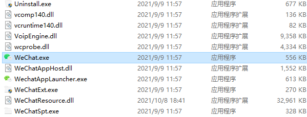在本站下载解压,得到微信pc绿色版免安装版软件包,进入主页面后下滑,点击WeChat.exe打开软件。