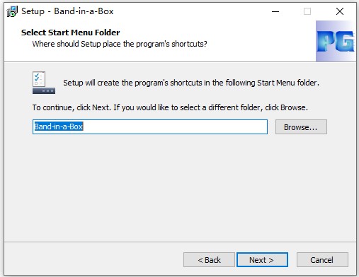 4、设置开始菜单文件夹名称,默认为“Band-in-a-Box”;