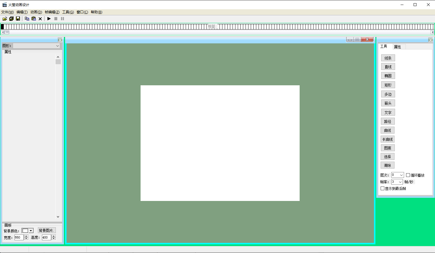 从窗口右边的工具选项卡选择图形工具后,在画板上按下左键移动便可绘制图形,在属性选项卡里可对选中的工具进行设置。也可以从菜单“动画/绘制元素”打开新窗口绘制。