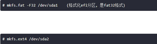 # mkfs.fat -F32 /dev/sda1 (格式化efi分区, 是fat32格式)