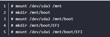 # mount /dev/sda1 /mnt/boot/EFI