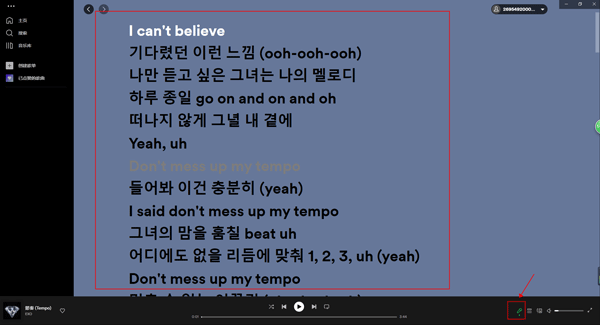 2、歌曲播放后下方会有歌曲的播放进度条,点击右边的歌词按钮。点击后就可以查看到歌词啦(温馨提示:歌曲进度条右边有歌词图标则代表此歌曲内置歌词,若没有则代表此歌曲暂时没上传歌词)