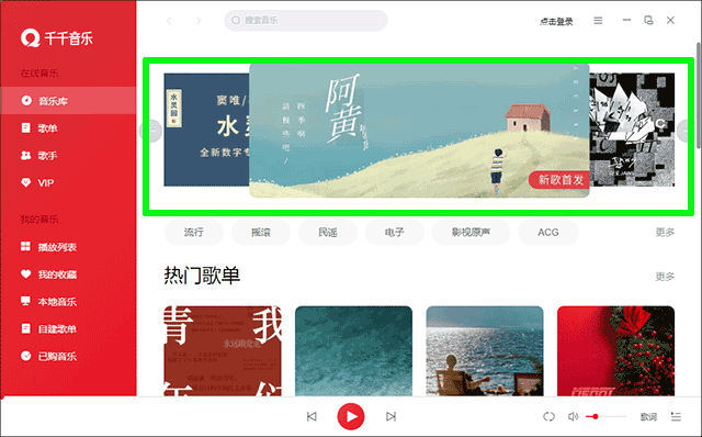 2、启动千千音乐电脑版,左边栏目包括在线音乐、我的音乐、自建歌单、收藏等;