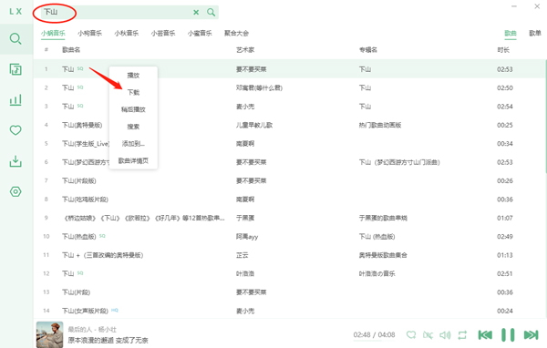 3、设置完之后在搜索框中输入歌名进行搜索,然后右击你想下载的歌曲,点击下载。