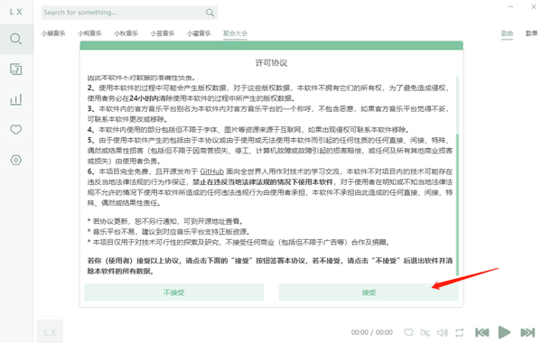 2、等待20秒时间阅读许可协议,点击接受即成功进入该音乐软件界面。