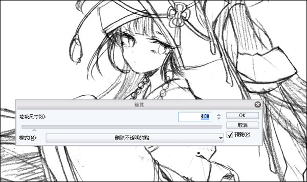 扫描好的图像在正常情况下图层整体都被白底涂满,因此选择[删除白底色中的点]。在透明的图层上描绘线稿的场合,或是待会叙述的白色背景透明化之后则是使用初始设定的[删除不透明的点]。