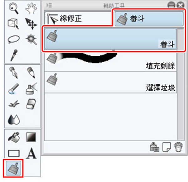 初期状态则是选择[工具]面板→[线修正]工具→[畚斗]辅助工具群组→[畚斗]工具。