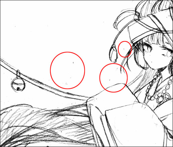 扫描手绘原稿时,根据扫描设定或纸张状态可能会产生对比度不够或出现非刻意造成的杂点和脏污。介绍清理线稿中较代表性的工作。这次是把扫描的图像当作底稿,在别的图层上重新描绘,因此下列步骤并非必须。