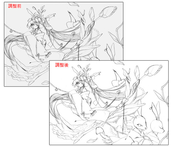 另外,若扫描好的线稿状态不理想的话,即使使用极端的色调补偿也不能避免线稿的劣化。再检查一次扫描的设定,正确地设置好原稿并重新扫描较能获得改善。