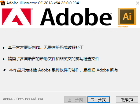 1、下载解压,双击“Illustrator+CC+2018+22.0.0.243.x64.exe”开始安装;