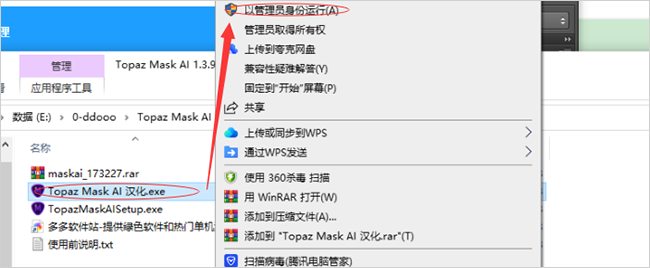 3、安装完成后返回之前解压的“Topaz Mask AI 1.3.91”文件夹,找到并选中“Topaz Mask AI 汉化.exe”,鼠标右键点击“以管理员身份运行”