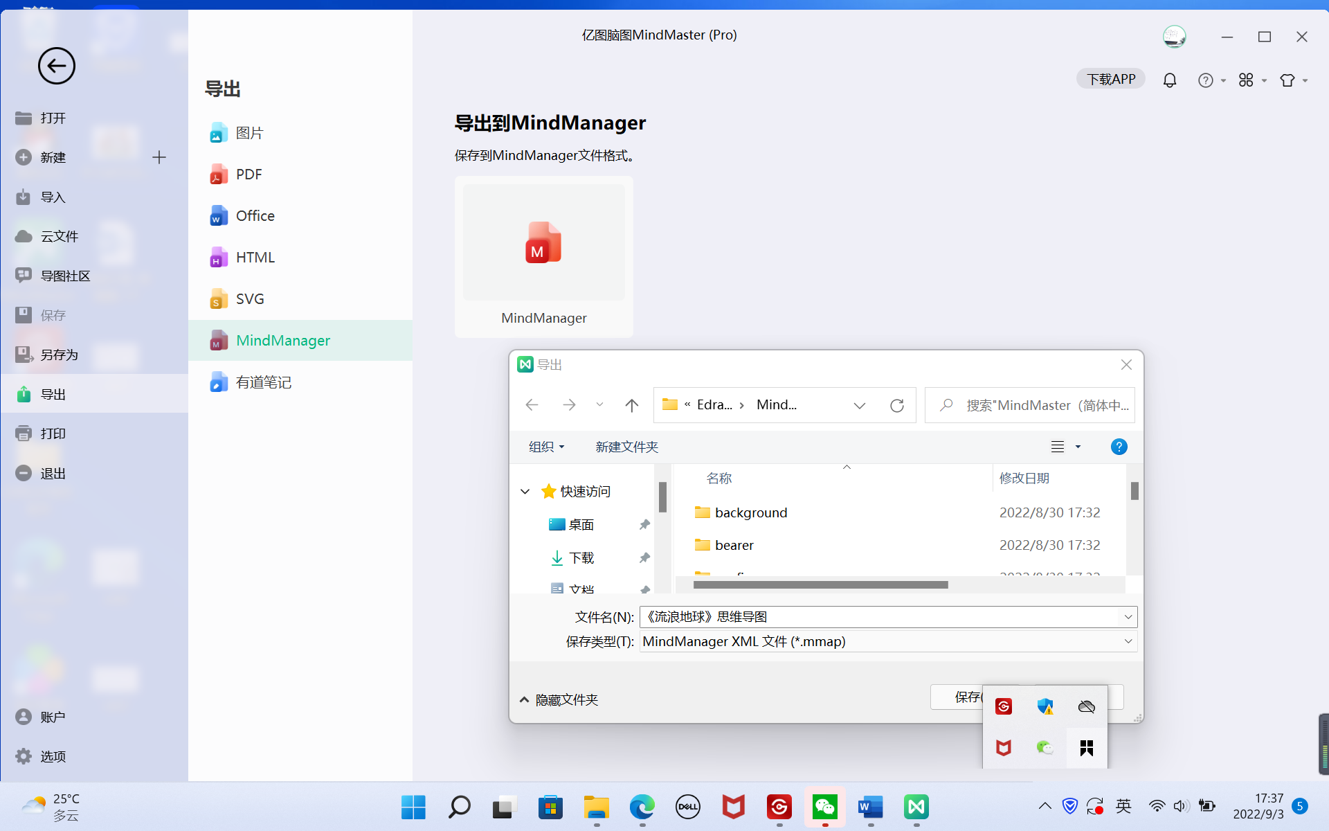 可以将思维导图导出为word、ppt、excel、pdf等文件格式,无需使用mindmaster软件就可以进行再次编辑、修改。同时mindmaster专业版还支持导出更高dpi图片格式,以及html和svg格式。