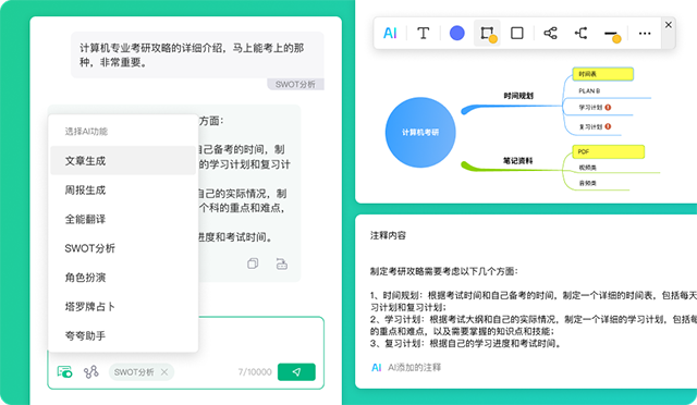 输入一段话,亿图脑图AI智能助手将快速输出对应场景方案,一键思维导图、智能注释、文案润色等。