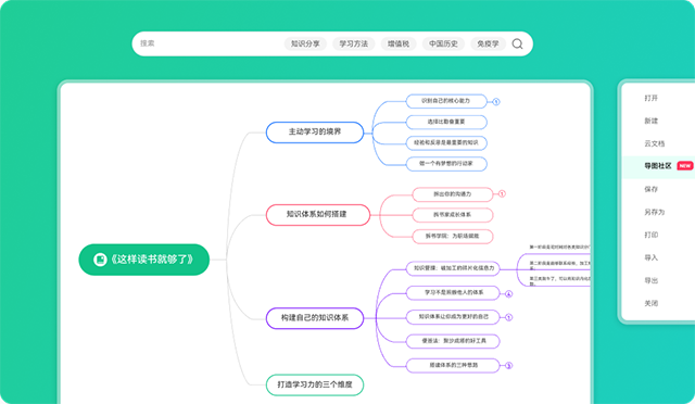 导图社区拥有数万幅原创思维导图作品,涵盖教育、职场、自我提升等各大领域的精华知识。每个人的作品不再是一座座“孤岛”,不同的知识在这里开始交织生长。